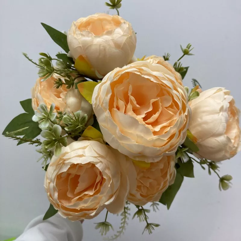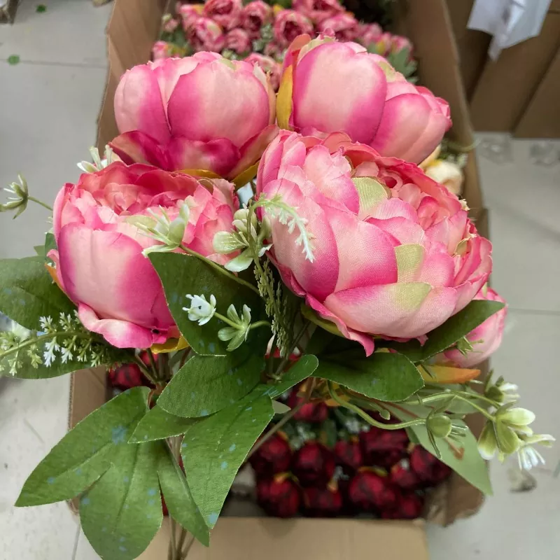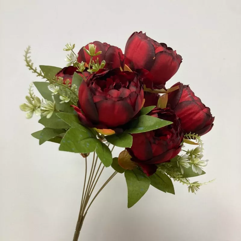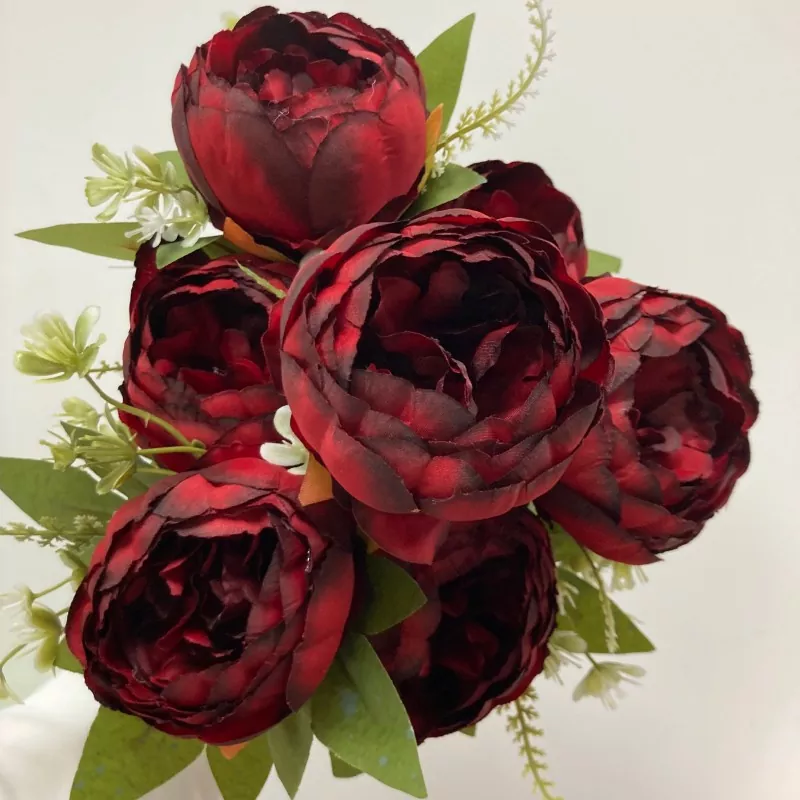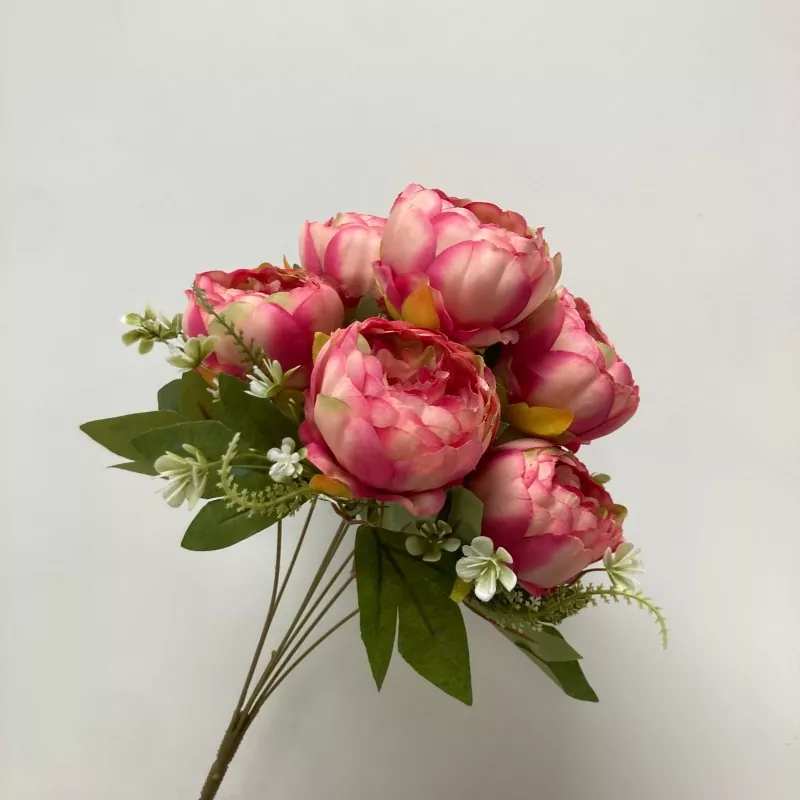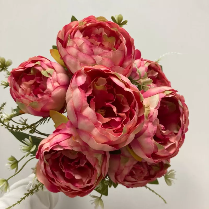 Hver bukett er 45 cm høy og inneholder syv silkekunstige peony blomsterhoder, hver 10 cm i diameter, pyntet med grønne blader og andre små blomster aksenter.
