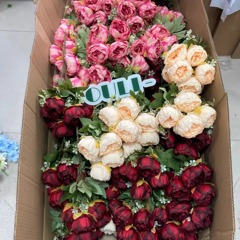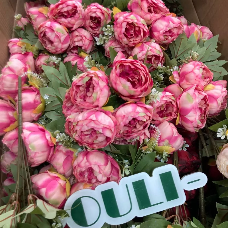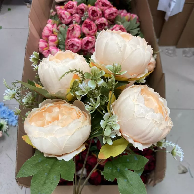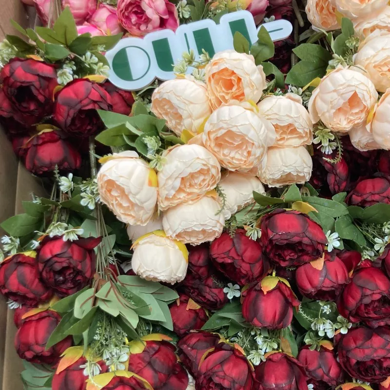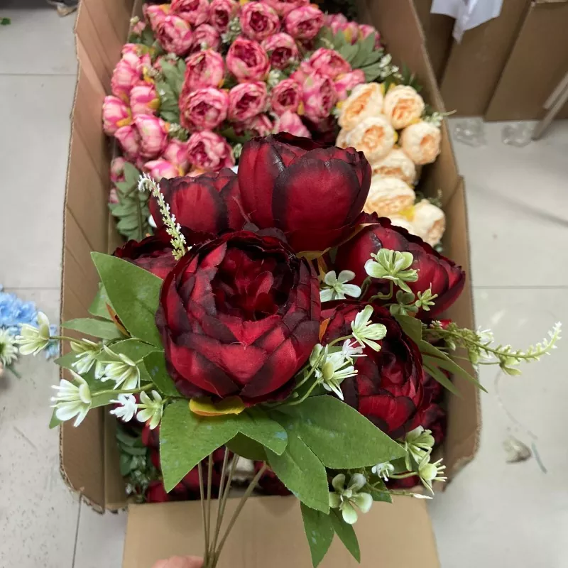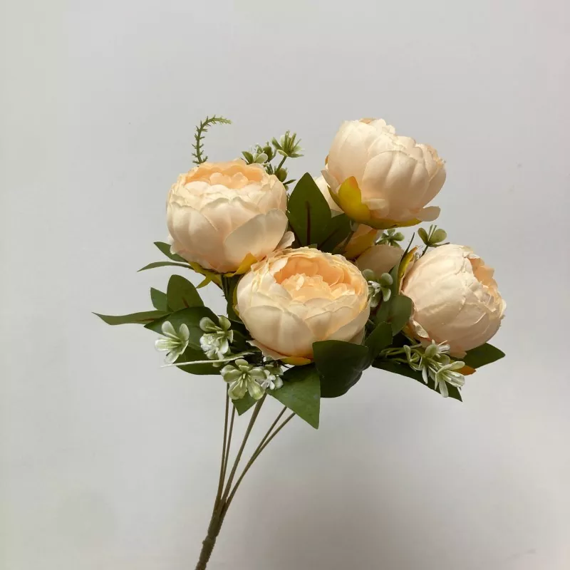 Hver bukett er 45 cm høy og inneholder syv silkekunstige peony blomsterhoder, hver 10 cm i diameter, pyntet med grønne blader og andre små blomster aksenter.